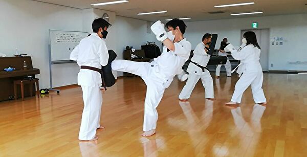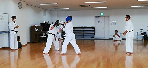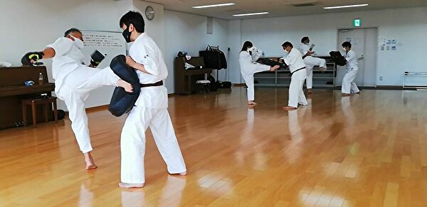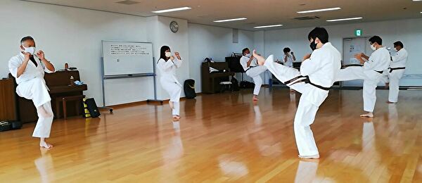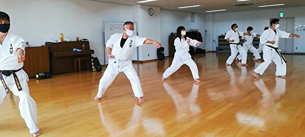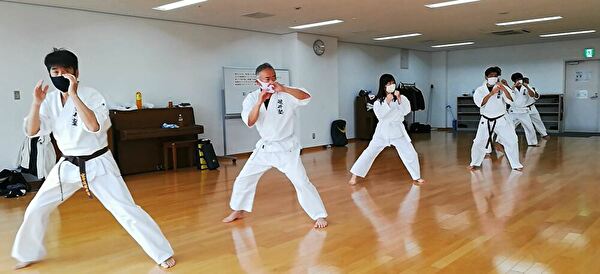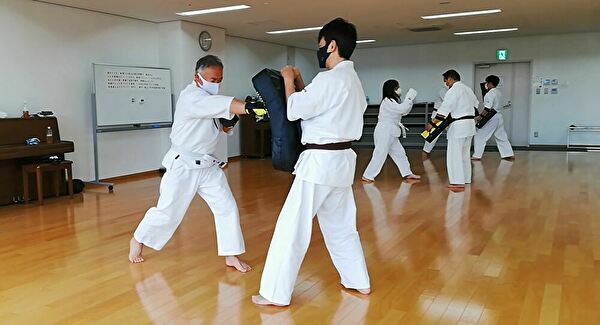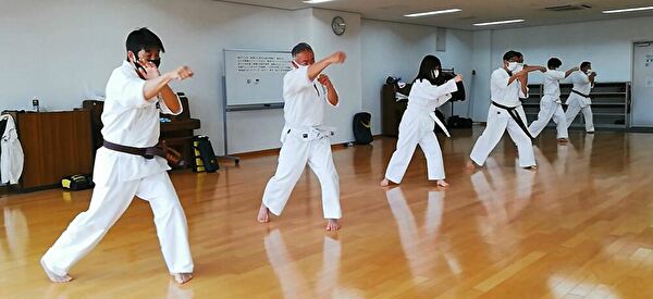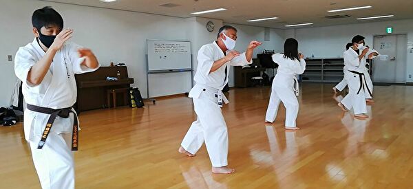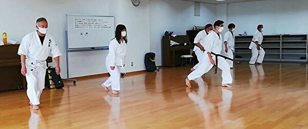 広いスペースを有効活用し、重心移動での移動稽古ならびに、斜め前方への躱し練習から