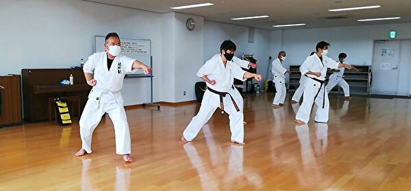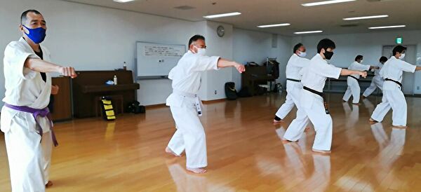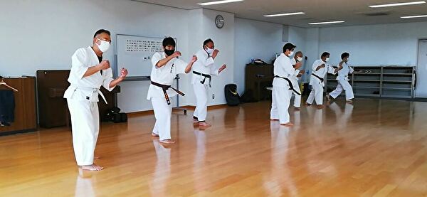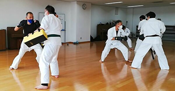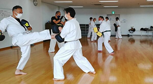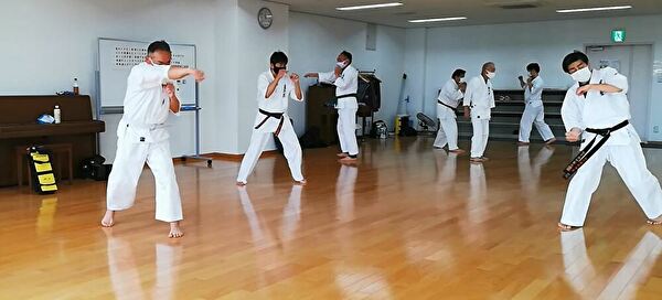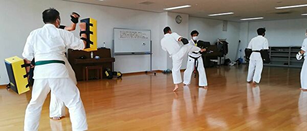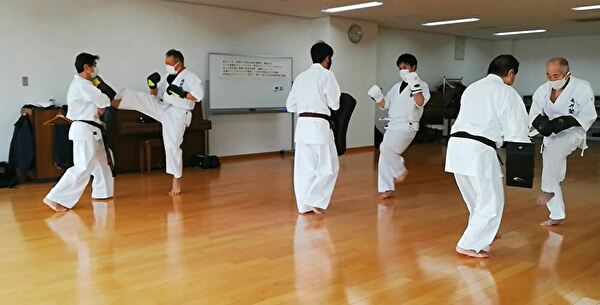 マルチスペース2の広い部屋をいっぱいに使い、基本・護身・重心移動・前蹴りカウンター・脳トレ・シャドー・ミット打ちと