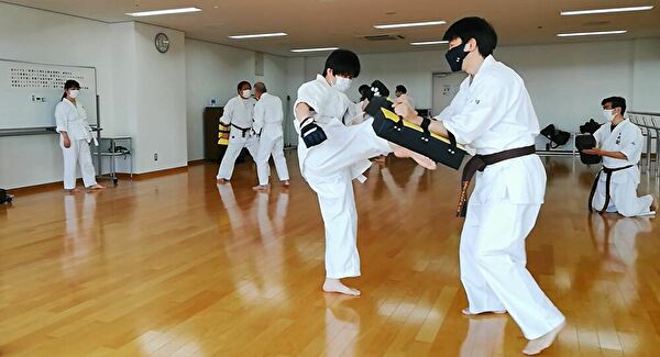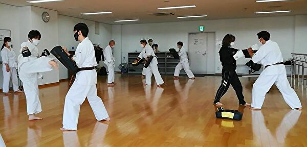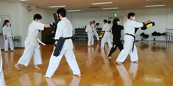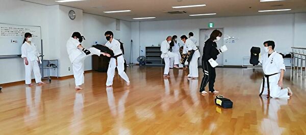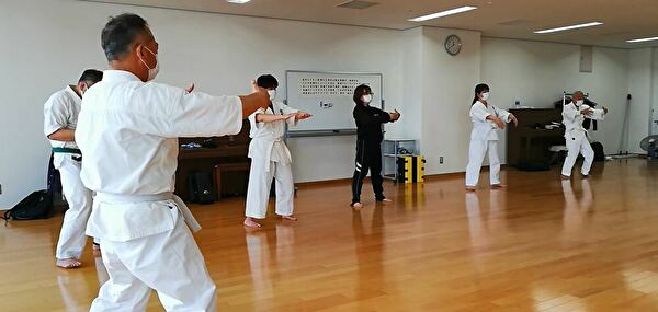 しっかり柔軟体操を行ったあと、初心者の方と一緒に正しい拳の握り方、前屈立ちの姿勢から突きの出し方、蹴り方などを習いました。
