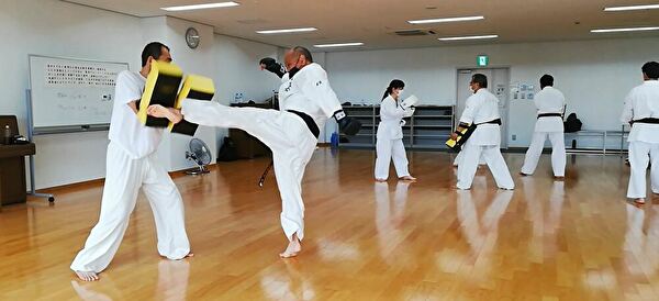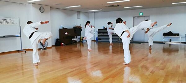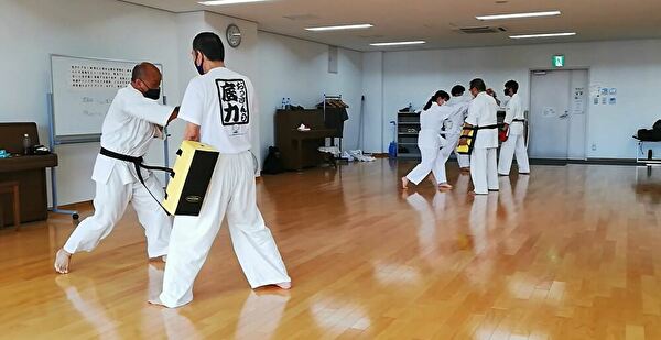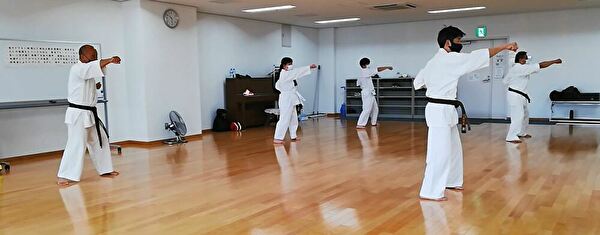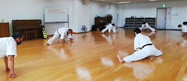 3台ある冷房を入れ、サーキュレーターも回して、広い会場の中、先週からメンバーに加わった空手経験者で気合十分なWさんを含め7名で稽古を行いました。