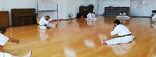 いつもどおり柔軟体操を行った後、ナイファンチ立ちからの基本稽古、連続蹴り、チョコチョコ走り、ナイファンチの型の練習をしました。