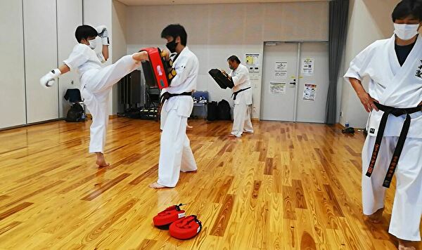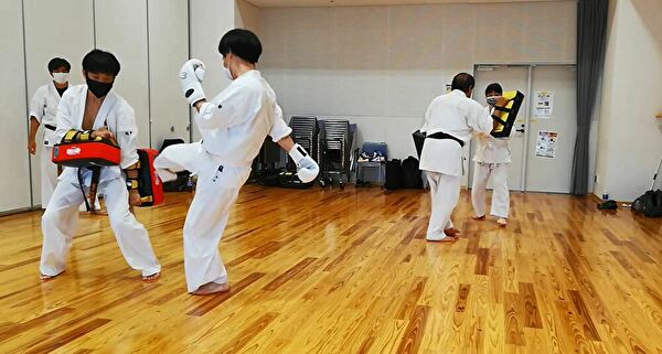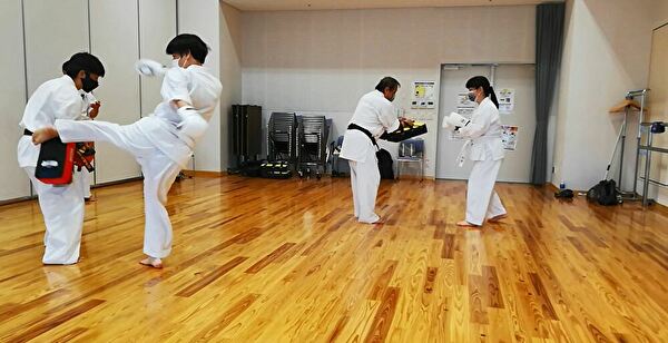 本日は、普段、あまりやらない練習として、回し蹴りでの軸足を返す練習を行いました。