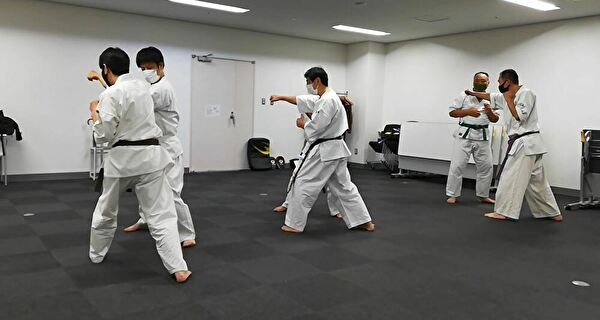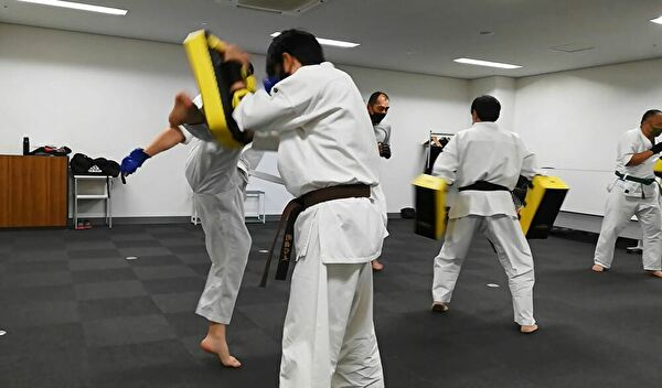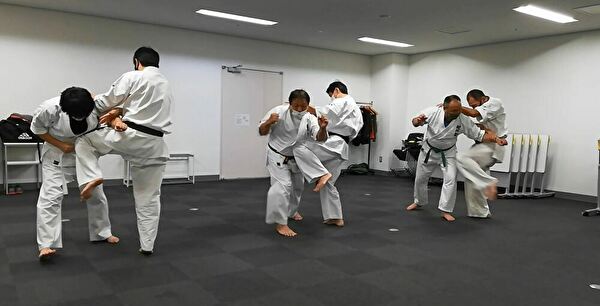 前屈立ちからの基本からスタートしますが、組手構えでの突き蹴り、重心移動を使った躱し、躱しからの反撃などモーニングクラスと違い、より武術的要素が高い練習を行うことができました。