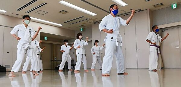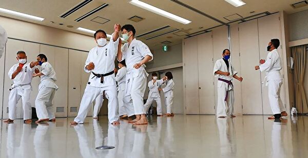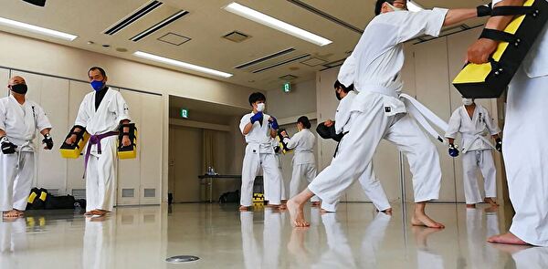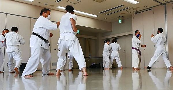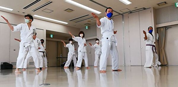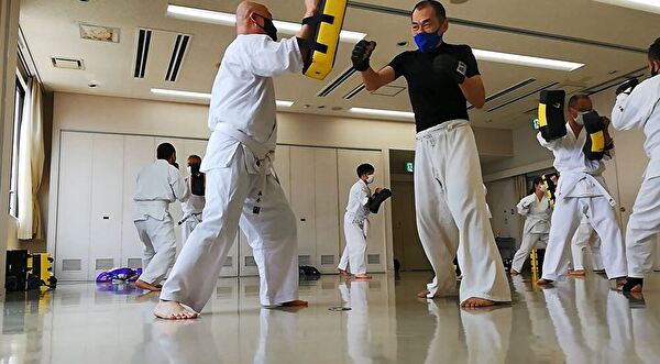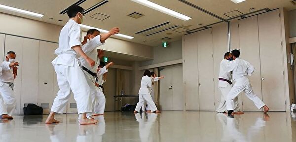 健康空手碇井塾でも「相手の攻撃を受けながら、躱しのステップで体の立ち位置を変え、突きを出す」というような護身要素満載の練習メニューが!