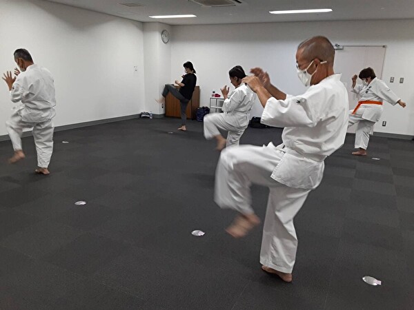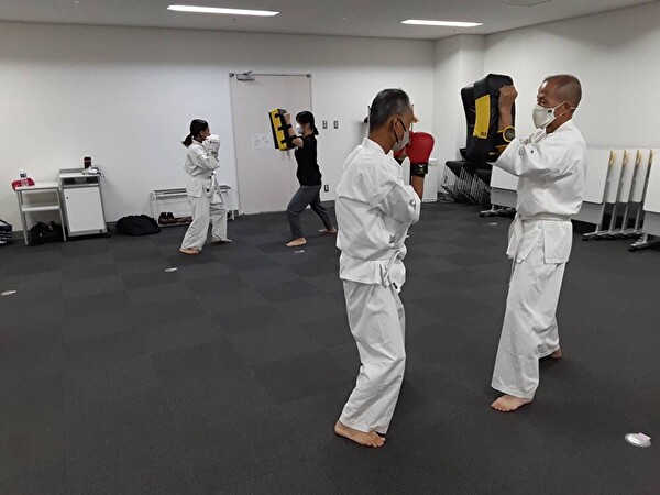 ストレッチ、チョコチョコ走り、スロトレの後、基本練習(突き、蹴り、膝蹴り、受け)、仕上げは、ミットへ打ち込み!