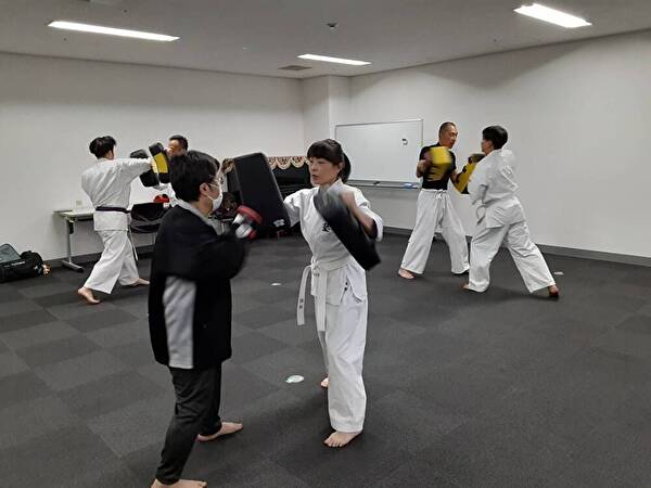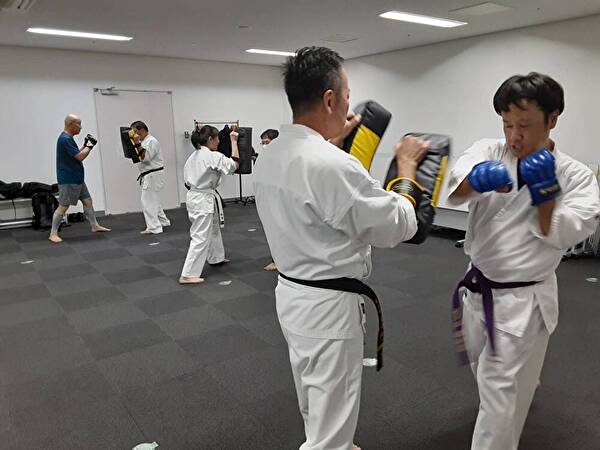 90秒のミット打ちの後に、先手相手の前進に伴う、こちら側の後進による当初の間合いを維持する動き、更に相手の前進・後進・左右四方向に動いても同様に当初の間合いを維持する動きの練習を行いました。